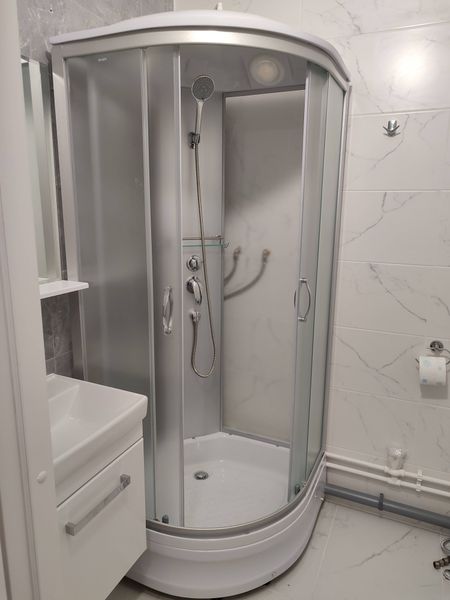 Соберём и установим кабину, обработаем герметиком, подключим смеситель и душ. Работу выполним за 2–4 часа. Будем перекрывать воду.